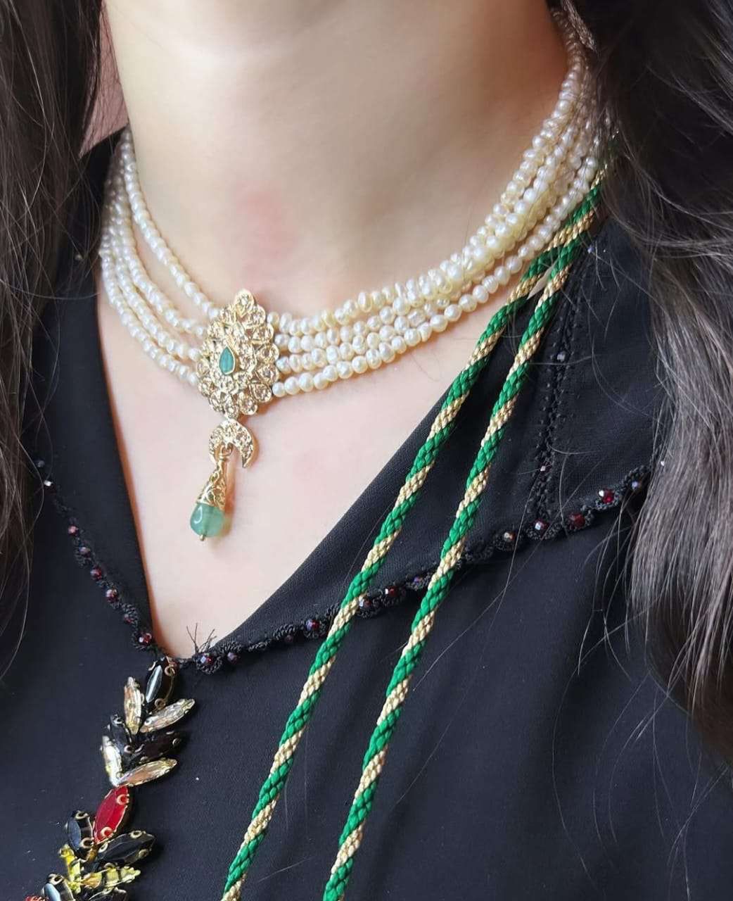 سلسلة رقبة فاخرة تجمع بين الجوهر الحر والذهب الخالص، مصممة على الطراز المغربي الأصيل الذي يمزج بين الفخامة الشرقية والحرفية التقليدية. تتميز هذه السلسلة بتفاصيل دقيقة مستوحاة من الزخارف الأندلسية والنقوش المغربية العريقة، حيث تتداخل المنحنيات الناعمة مع أشكال هندسية متناسقة، مما يمنح القطعة طابعاً فنياً راقياً ومظهراً مميزاً.